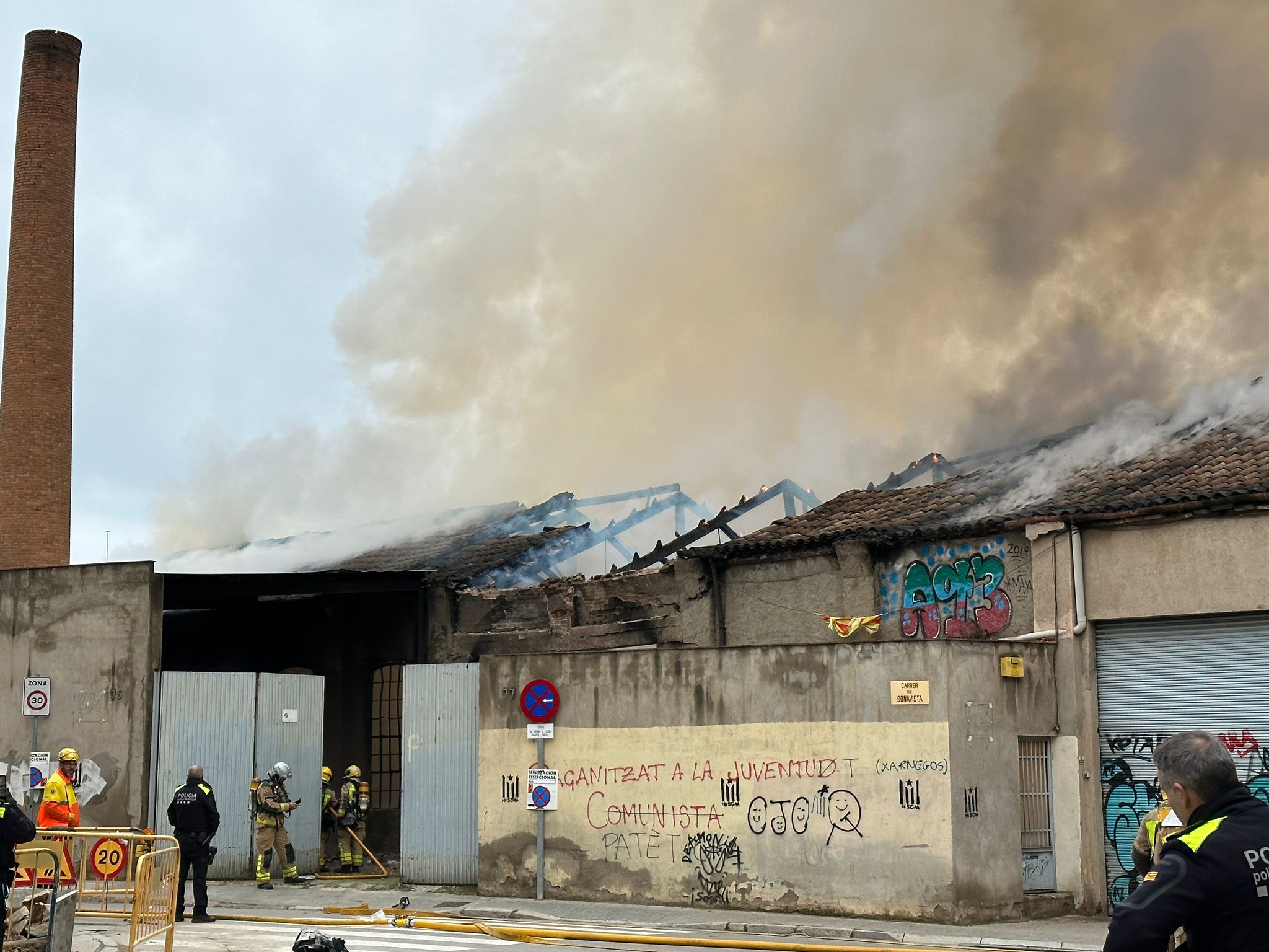 Hi treballen quatre dotacions dels Bombers. La nau està situada al carrer Bonavista i estaria buida. El foc ha provocat una intensa columna de fum